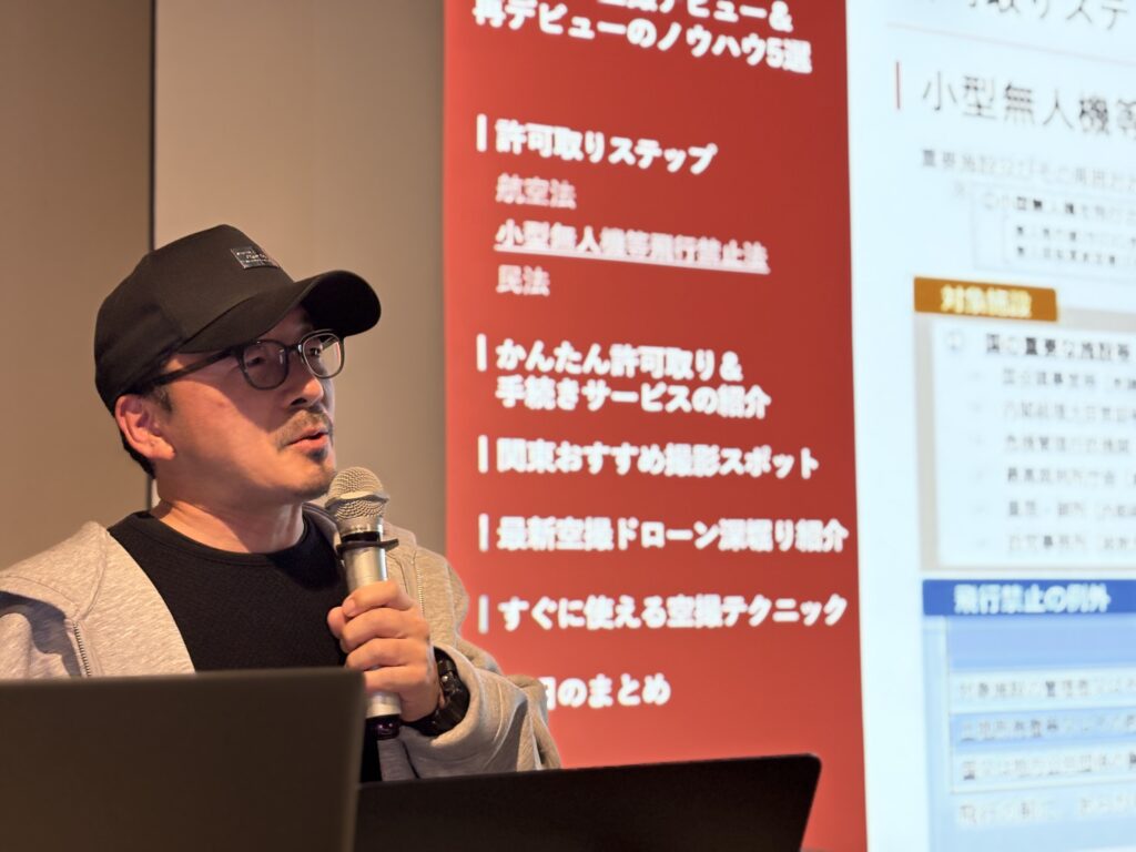 後半では、田口から「ドローンは飛ばせる場所がナイなんてウソ!ドローン空撮デビュー&再デビューのノウハウ5選」として、撮影の許可取りやおすすめスポット、空撮テクニックを解説しました。